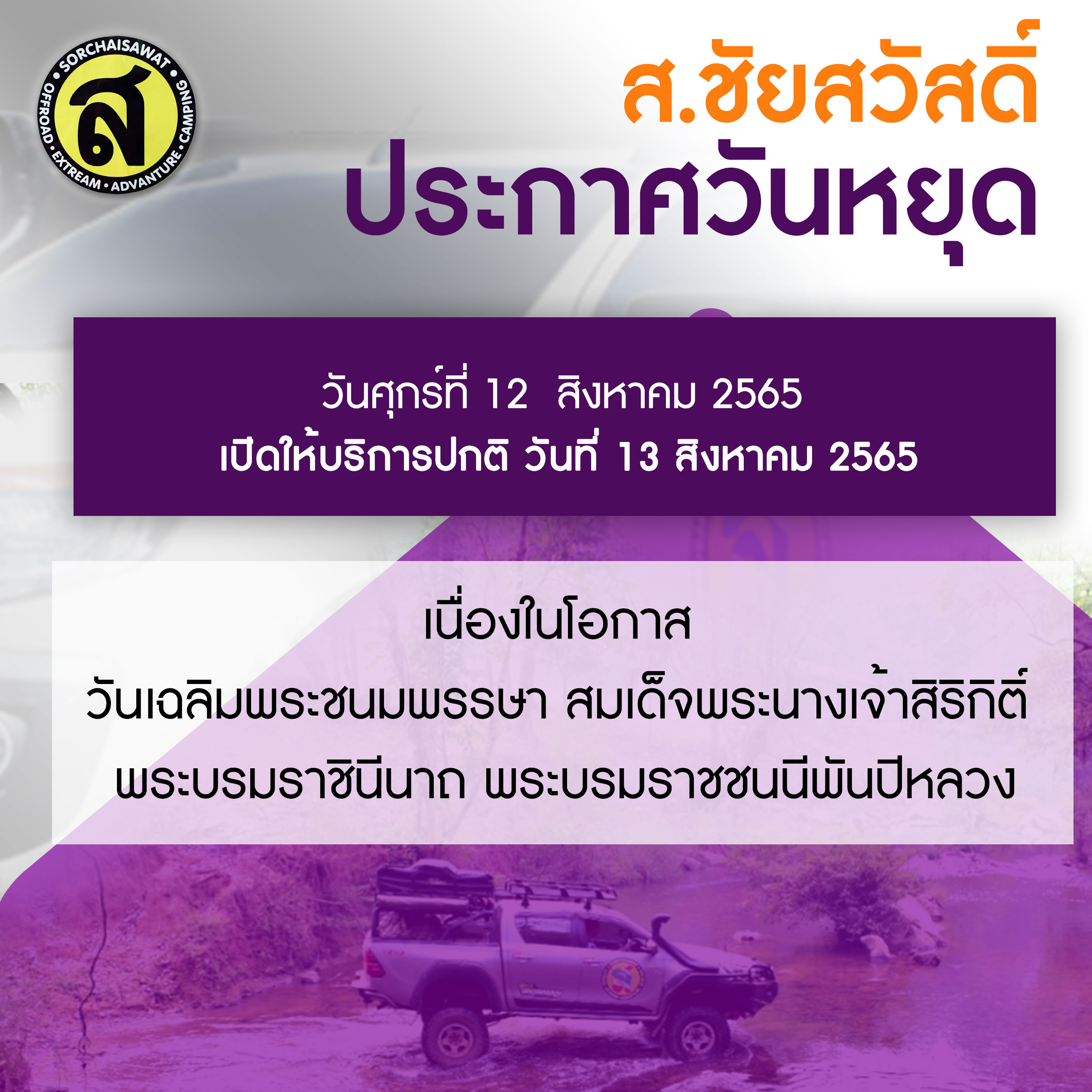 ส.ชัยสวัสดิ์ ประกาศวันหยุด วันศุกร์ที่ 12 สิงหาคม 2565 เปิดให้บริการปกติ วันที่ 15 สิงหาคม 2565